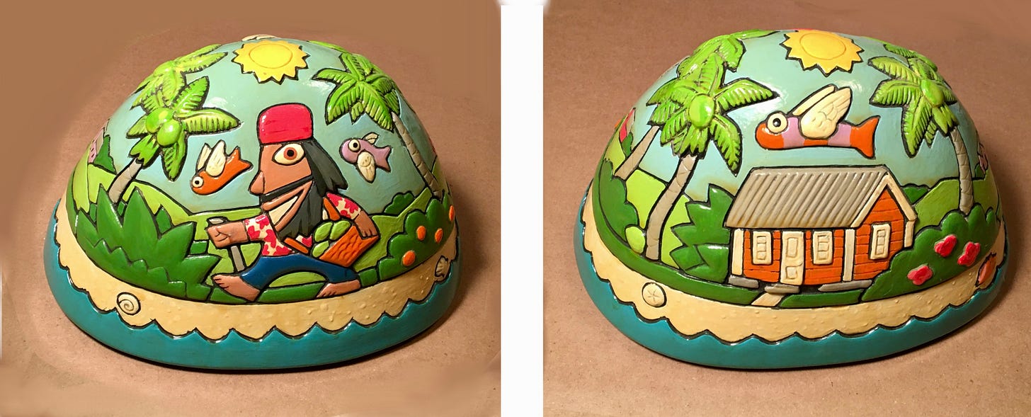 Sadly I can’t find any more photos of the ceramic pieces I made. They were mostly cutesy-pie tchotchkes. Often island-themed because I was enjoying that vibe at the time. After the first year we were all pretty tired of the project. The kiln was sold, and I moved on to the next art medium that caught my fancy.
