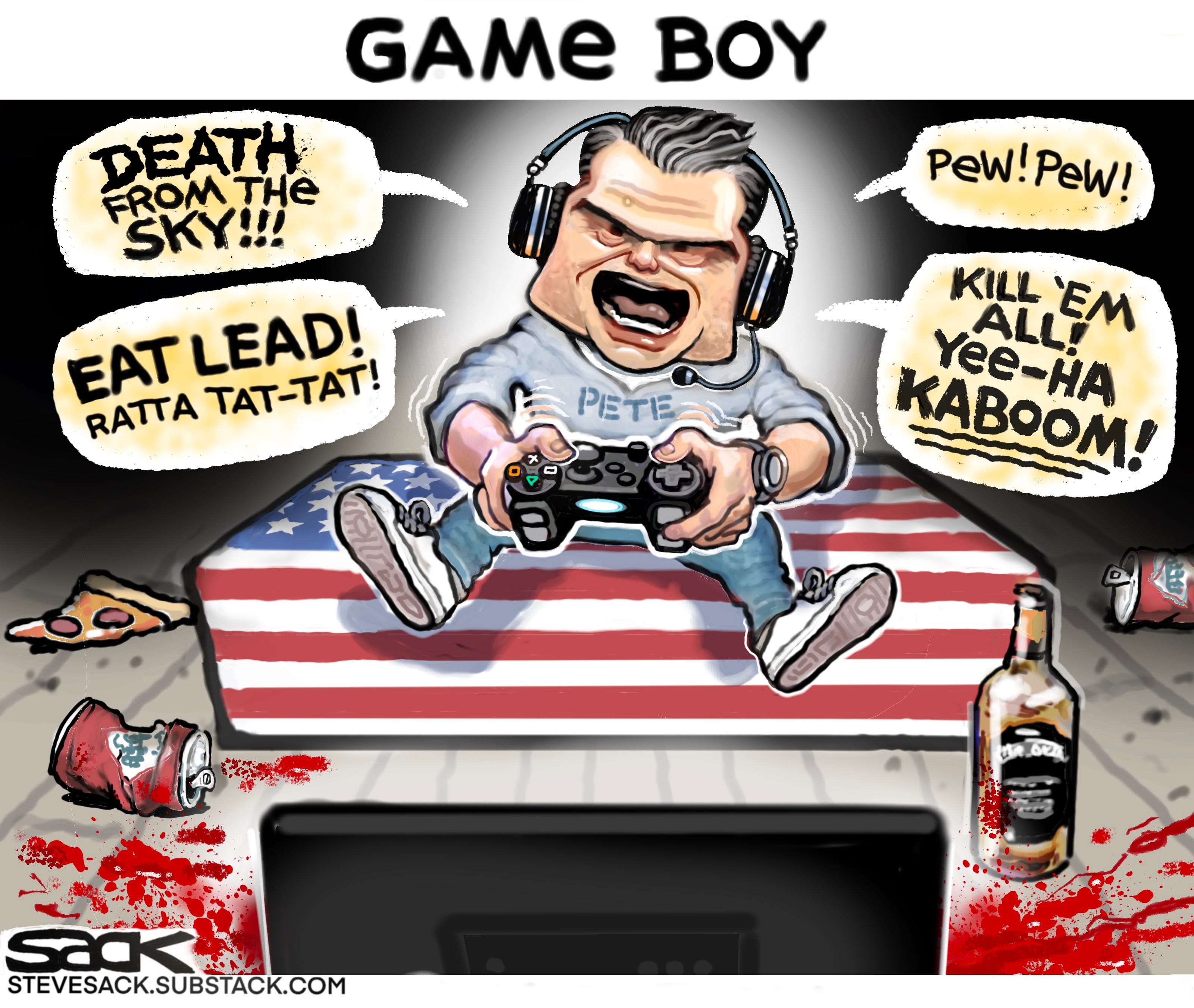 A new Sask cartoon about Pete Hegseth, America’s war cheerleader