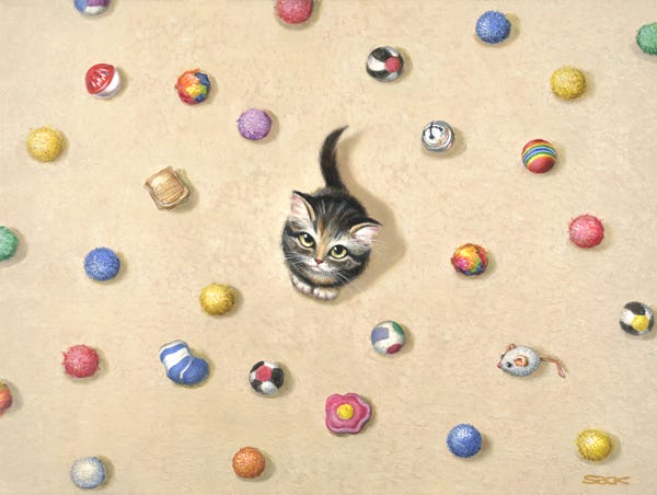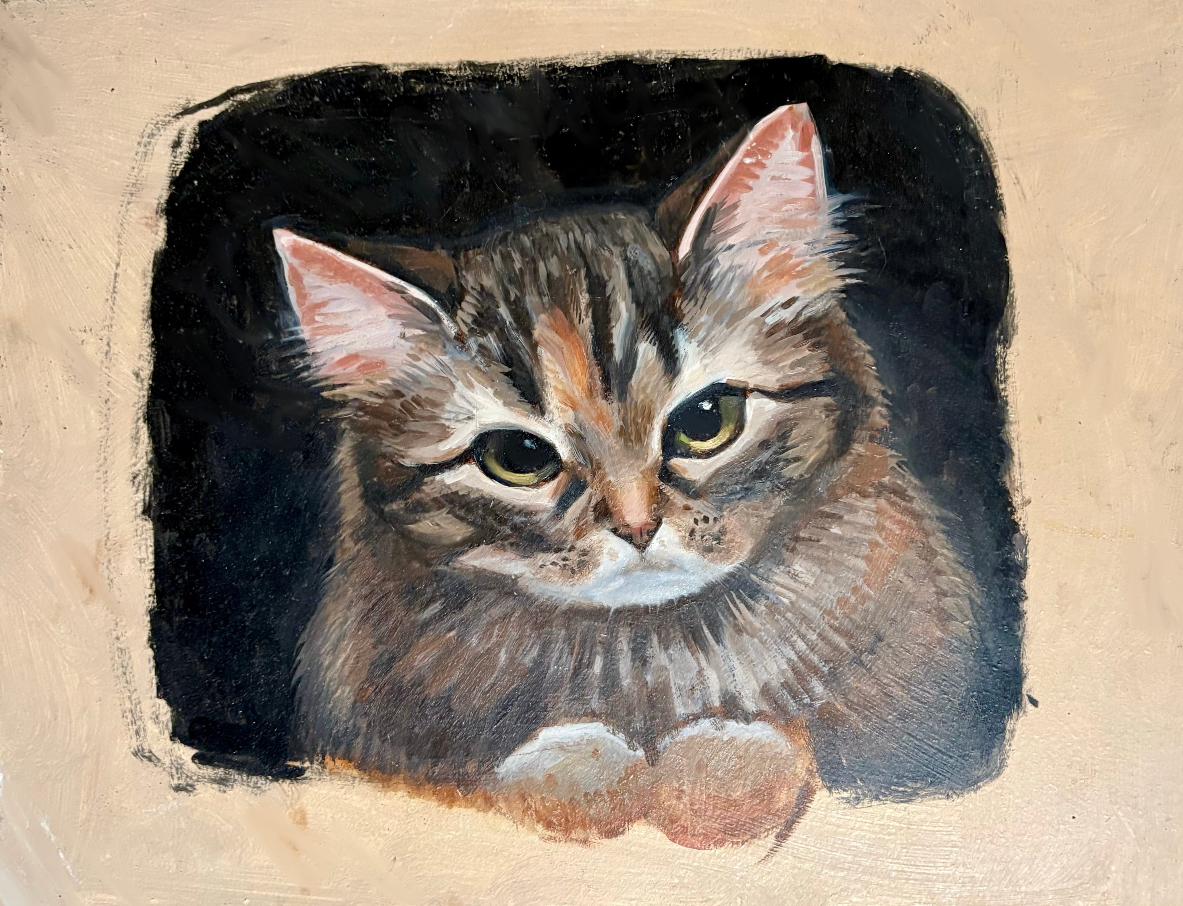 About the time I decided to try oil painting we got a new cat. So, naturally, I had a nice subject to pose for me. By “pose” I mean let me take a photo and then paint a copy of it.